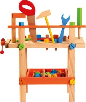 Diese Werkbank ist mit jeder Menge Werkzeug ausgestattet. Hier können sich kleine Heimwerker und Bastlerinnen so richtig austoben. Das macht nicht nur Spaß, sondern trainiert auch die Koordination und Geschicklichkeit.