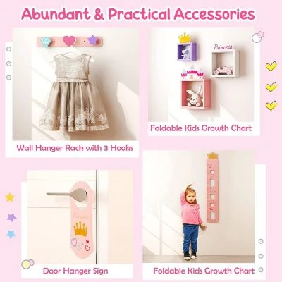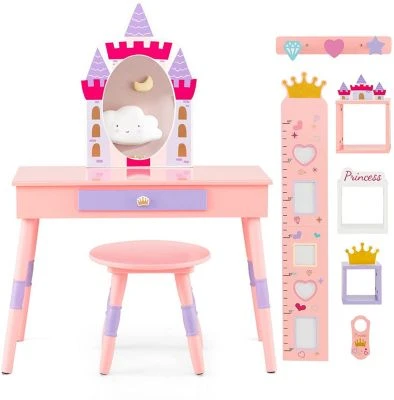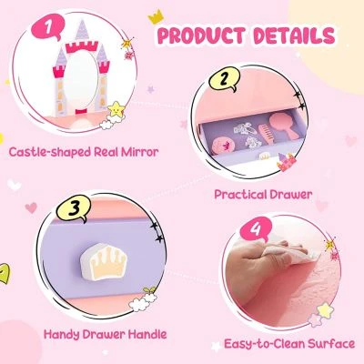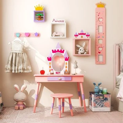 Dieses entzückende Schminkset mit Schlossmotiv ist ein perfektes Geschenk für Ihre kleine Prinzessin! Der Schminktisch mit abnehmbarem Spiegel erleichtert den Kindern das Schminken und dient gleichzeitig als Schreibtisch. Außerdem verfügt der Schminktisch über eine große Schublade zur Aufbewahrung von Schmuck, Beauty-Accessoires usw. Ihres Kindes. Ein zusätzliches Höhenlineal, drei Wandablagen, drei Haken und ein Türschild sind ebenfalls enthalten.