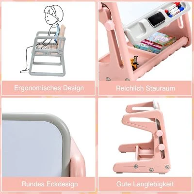 Unser Kinder-Zeichenbrett mit Stuhl wird dauerhaft Freude bereiten und Ihre Kinder durch ihre Kindheit begleiten. Dieses 2-in-1-Kindermalbrett mit Stuhl kann zudem als Tisch verwendet werden, und Sie können es im Winkel verstellen, um es zu einem Zeichenbrett zu machen. Sowohl die Tischplatte als auch die Unterseite des Tisches sind mit Einkerbungen versehen, sodass Ihr Kind genügend Platz hat, um darin Marker, Radiergummi, Spielzeug und andere Kleinigkeiten aufzubewahren. Das geruchlose HDPE-Material und die abgerundeten Ecken dienen der Sicherheit Ihres Kindes. Die bequeme Rückenlehne stützt den Körper des Kindes. Untersetzer verhindern effektiv, dass der Boden zerkratzt wird. Der Tisch lässt sich mit nur wenigen Handgriffen aufstellen, wodurch Sie Zeit und Energie sparen.