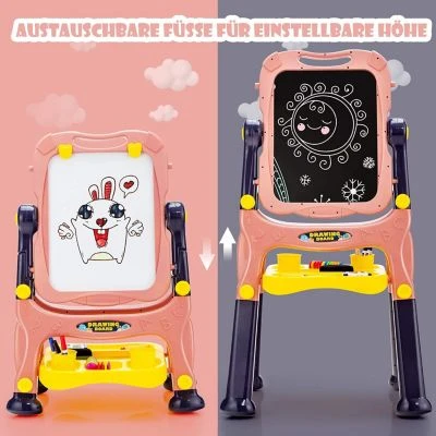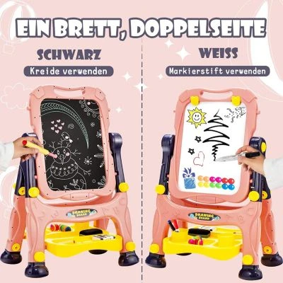 Diese magnetische Maltafel ist die perfekte Geschenkidee für kreative und malbegeisterte Kinder. Sie verfügt über eine konische, dreieckige Struktur für hervorragende Stabilität und kann dabei dank des praktischen 2-in-1-Designs sowohl als Magnet- als auch als Schreibtafel verwendet werden. Die Tafel kann hierbei problemlos abgenommen werden, um die Kunstwerke unterwegs weiter vervollständigen zu können. Das Gestell ist hierbei auf zwei unterschiedliche Höhen einstellbar und wird mit jeder Menge Zubehör, inklusive Marker, Kreide und Radiergummi geliefert, welches im komfortablen Ablagefach sicher verstaut werden kann.