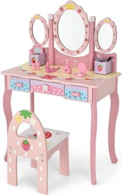 Dieses Set mit klappbarem Spiegel ist eine wundervolle Ergänzung für Kinderzimmer.Die exzellenteMDF-Konstruktion bietet Ihnen Stabilität und Sicherheit.Auf der großen Oberseite und in den 3 Schubladen ist viel Platz für alle möglichen Gegenstände.Zwei Teile des Spiegels können zudem eingeklappt werden, wodurch er sehr praktisch ist.Natürlich können Sie ihn auch vollständig abnehmen und den Tisch dadurch in einen Schreibtisch verwandeln. Sollten Sie noch nach einem solchen Set suchen, dann schlagen Sie jetzt zu!