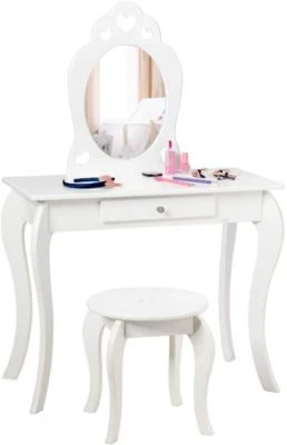 Fragen Sie sich, was Sie ihrem Kind zum Geburtstag oder zu Weihnachten schenken sollen? Unser kinder Schminktisch ist das perfekte Geschenk für Ihr kleines Mädchen. Hergestellt aus hoch verdichteten Brettern und Kiefernholz, ist das gesamte Set sehr stabil und kann über einen langen Zeitraum hinweg verwendet werden. Zusätzlich sind die abgerundeten Ecken und die anti-rutsch Unterlagen nur zwei der Arten, wie wir unseren Schminktisch kindersicher gemacht haben.