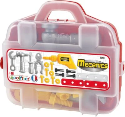 Dieser Koffer von Ecoiffier enthält alles was ein kleiner Handwerker braucht. Der Koffer ist teilweise transparent, sodass der Inhalt zum Teil zu sehen ist.