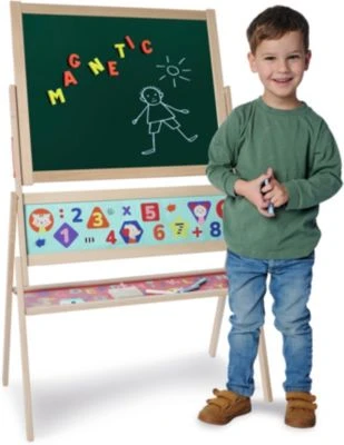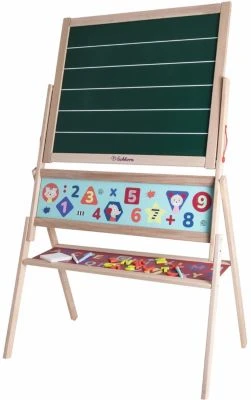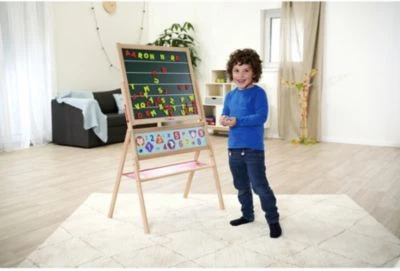 Diese doppelseitige Standtafel aus dem Hause Eichhorn eignet sich klasse für Mal- und Lernspaß im Kinderzimmer. Auf der magnetischen Seite lassen sich mit den Magnetbuchstaben Wörter und Sätze bilden, sodass Kinder spielerisch das Buchstabieren lernen. Die andere Seite kann mit den zehn Kreiden bemalt und beschrieben werden. Hier ist auch jede Menge Platz für Rechenaufgaben! Mit dem Schwämmchen ist die Tafel im Nu wieder sauber.