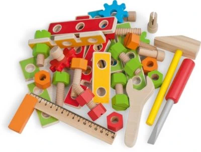 In der 40-eiligen Werkbank von Eichhorn findet alles seinen Platz! Dazu gehören die Säge, der Schraubstock, der Schraubenschlüssel und viel weiteres Zubehör wie Schrauben, Muttern und Verbindungselemente. Im unteren Ablagefach kann man diese Kleinteile gut zu verstauen.