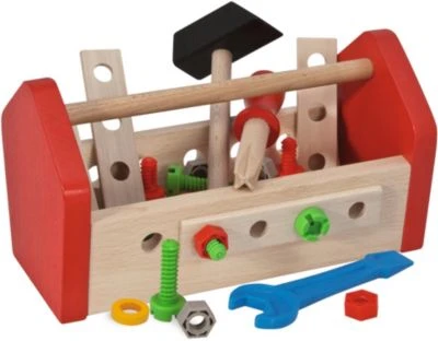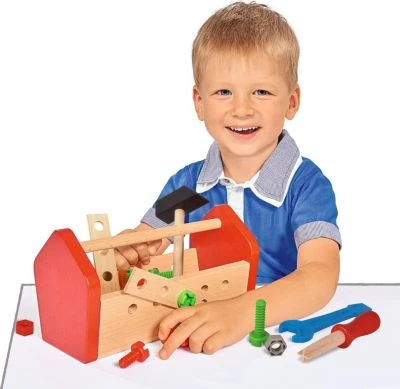 Mit dem Werkzeugkasten können die kleinen angehenden Handwerker ihre motorischen Fähigkeiten entwickeln und verbessern. In der Werzeugbox sind Schrauben, Verbindungselemente, Schraubenzieher, Hammer und vieles mehr enthalten.