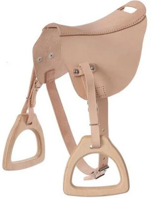 Es handelt sich um ein sogenanntes Reitkissen. Der Vorteil ist, es sieht aus wie ein Sattel, ist aber um ein vielfaches leichter, so dass Ihr Kind selbst ganz bequem auf- und absatteln kann. Damit nichts verrutscht, gibt es einen Bauchgurt, der um den Korpus des Holzpferdes festgezogen wird. Selbstverständlich bietet der Sattel auch in der Höhe verstellbare Steigbügel.