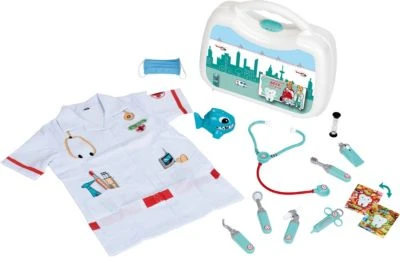 Heute geht es zum Zahnarzt! Müssen die Kuscheltiere auch mal zum Doktor? Oder sind es die Eltern, die heute bei den angehenden Zahnärzten und Dentaltechnikerinnen einen Termin haben? Mit diesem umfangreichen Spieleset „Zahnarztkoffer deluxe“ von klein kommen alle notwendigen Zubehörelemente für die großen Untersuchungen. Hinein geschlüpft in den Ärztekittel und die Untersuchung geht los. Bitte den Mund weit aufmachen! In den praktischen Koffer passen alle Gegenstände und lassen sich so auch prima zu „Außer Haus“ Besuchen mitnehmen.