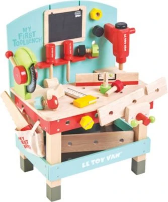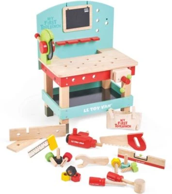 Eine erste hölzerne Werkzeugbank mit 20 Teilen. Sie enthält Elektrowerkzeuge wie Bohrer und Kreissäge, außerdem einen Schraubstock, eine Säge, einen Hammer, einen Schraubendreher, eine Wasserwaage, ein rechtwinkliges Lineal, einen Schraubenschlüssel und eine Tafel. Dazu ein praktisches Ablagefach und zwei Bretter mit Schrauben und Muttern.