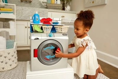 Kinder wollen sich stets so erwachsen fühlen wie Mama und Papa. Mit diesem tollen Spiel-Waschtrockner aus dem Hause Little Tikes geht dieser Wunsch in Erfüllung! Die Waschmaschine sieht besonders realistisch aus und ist mit vielen Funktionen sowie authentischen Licht- und Soundeffekten ausgestattet. So lässt sich die Türe öffnen, die Wäschetrommel drehen und das Waschmittelfach herausziehen. Auch jede Menge Zubehör ist dabei, sodass das Spielerlebnis besonders toll wird.