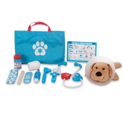 • Tierarztbedarf umfasst Stethoskop, Thermometer, Spritze, Bandagen, Schläuche und Wannen mit „Behandlungen“, einen Gipsverband für Boo-Boos, Halskegel