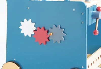 Material: Lindenholz, MDF, gummierte Holzräder. Stahlachsen