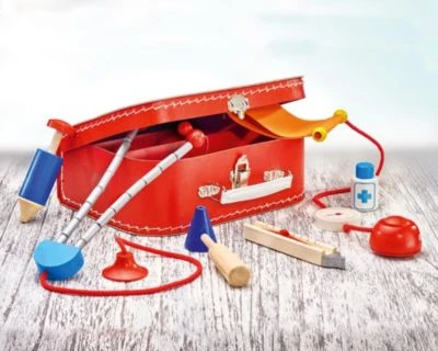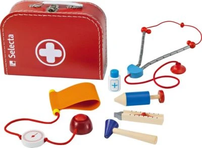 Gerade etwas schlapp? Dann hilft bestimmt ein Besuch beim jungen Arzt im Kinderzimmer! Der hat in seinem schicken Koffer viele stabile Geräte, die man für eine Untersuchung braucht – und alles im kindgerechten, sicheren Design. Mit dem Arztkoffer von Selecta können sich die Kleinen schon wie richtige Ärzte fühlen! Das aus Holz bestehende Medizinbesteck ist hochwertig verarbeitet und sorgt mit dem niedlichen Design für ordentlichen Spielspaß. Es sind alle Geräte dabei, die man für die Untersuchung eines Patienten benötigt. Wer wird als nächstes verarztet?